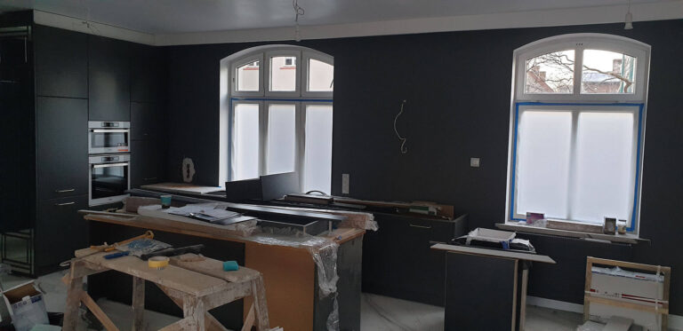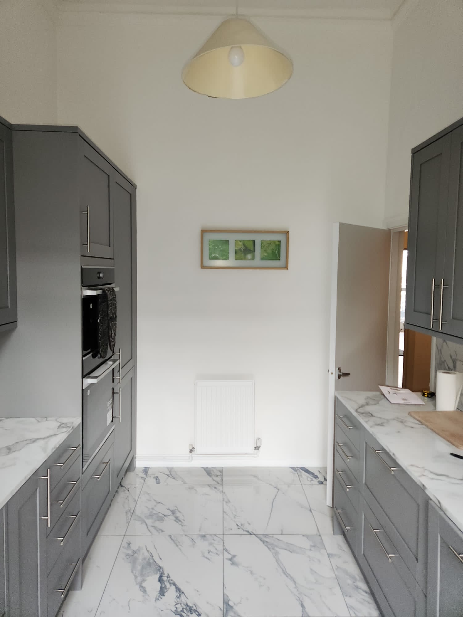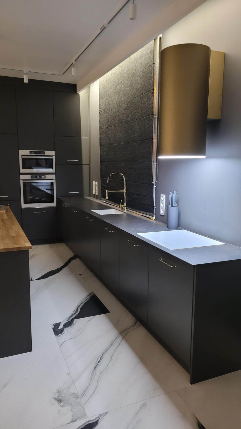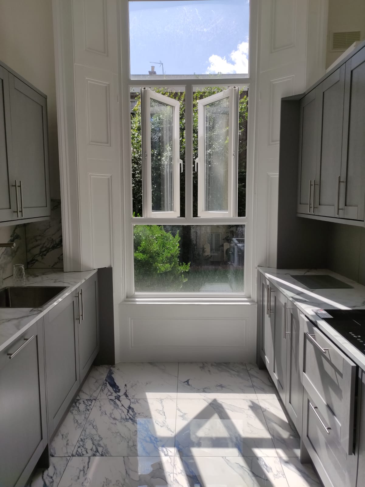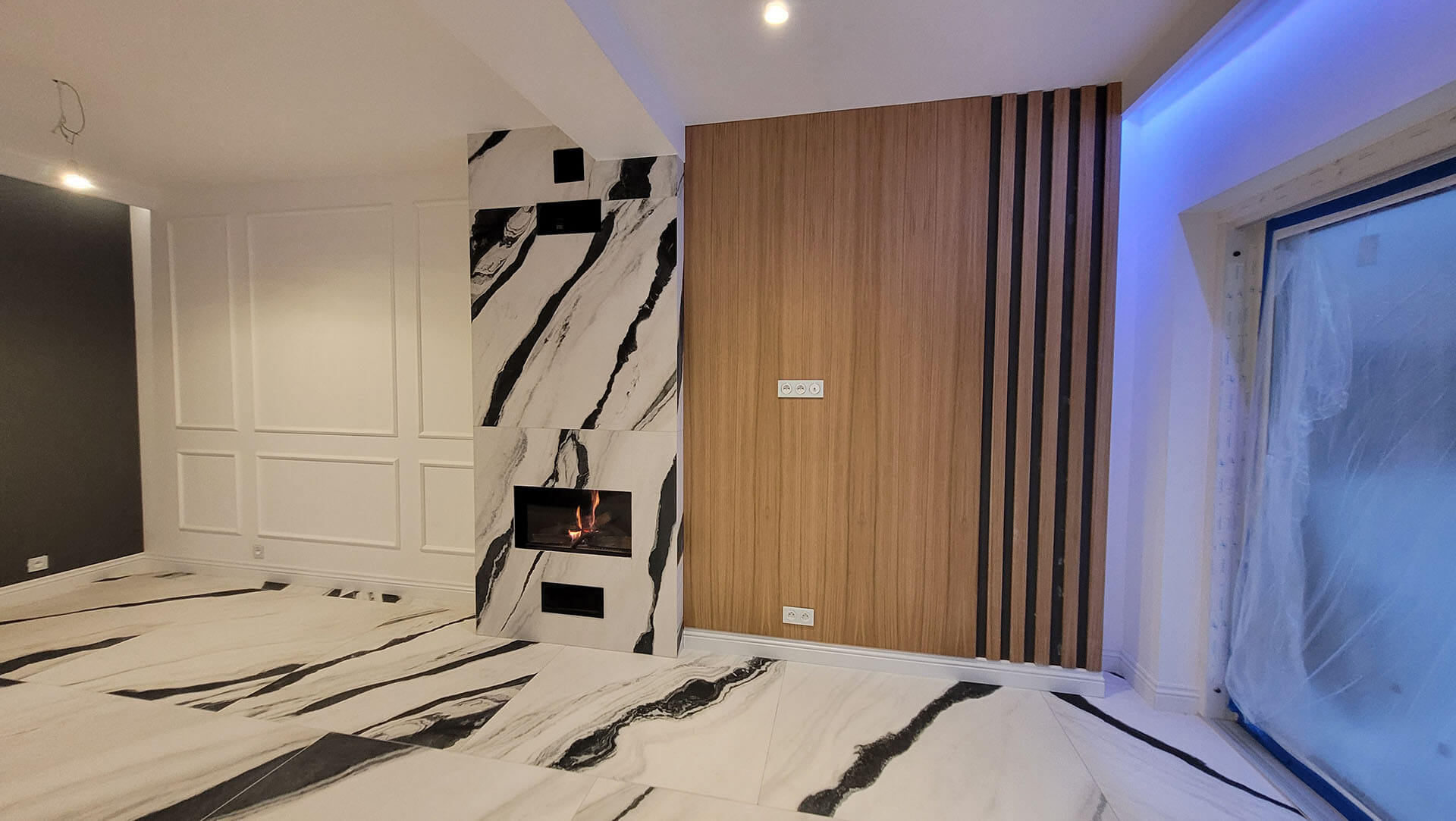 Our highly skilled trade professionals design, create and fit your dream kitchen including the installation of appliances, both electrical and hydraulic. This premium bespoke kitchen combines the living room and dining area. Marble has been used to intertwine with wooden panels to create a beautiful, warm finish.