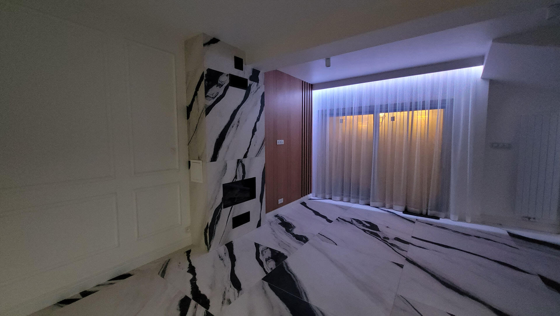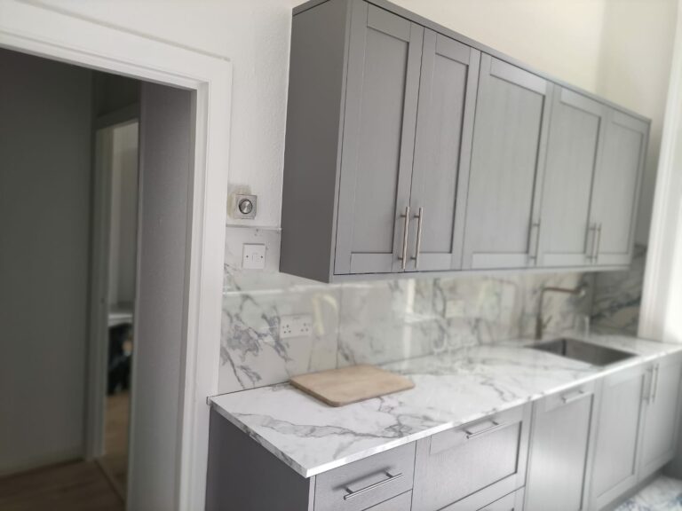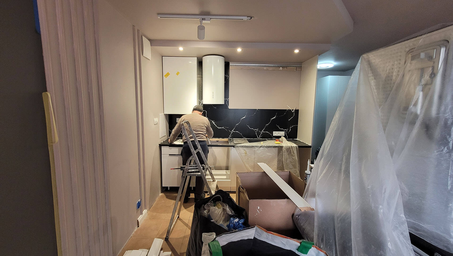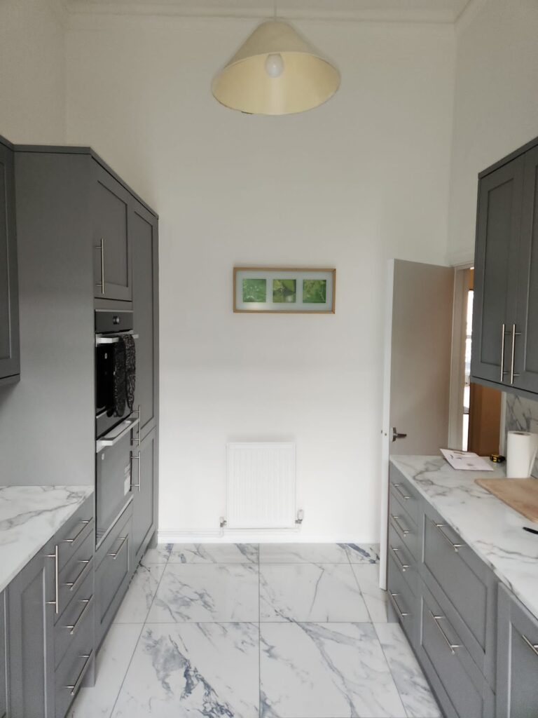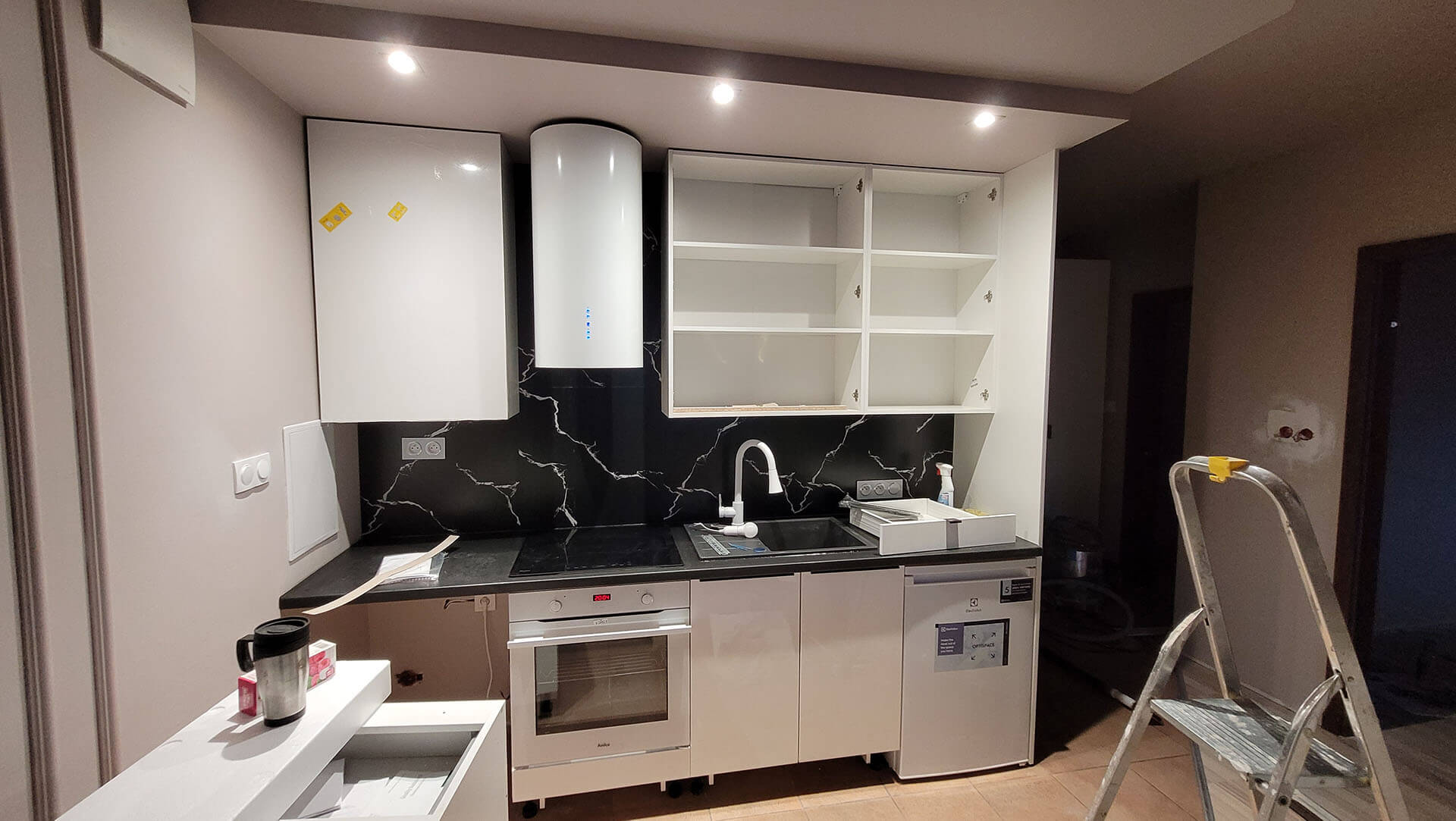 Our highly skilled trade professionals design, create and fit your dream kitchen including the installation of appliances, both electrical and hydraulic. This premium bespoke kitchen combines the living room and dining area. Marble has been used to intertwine with wooden panels to create a beautiful, warm finish.
